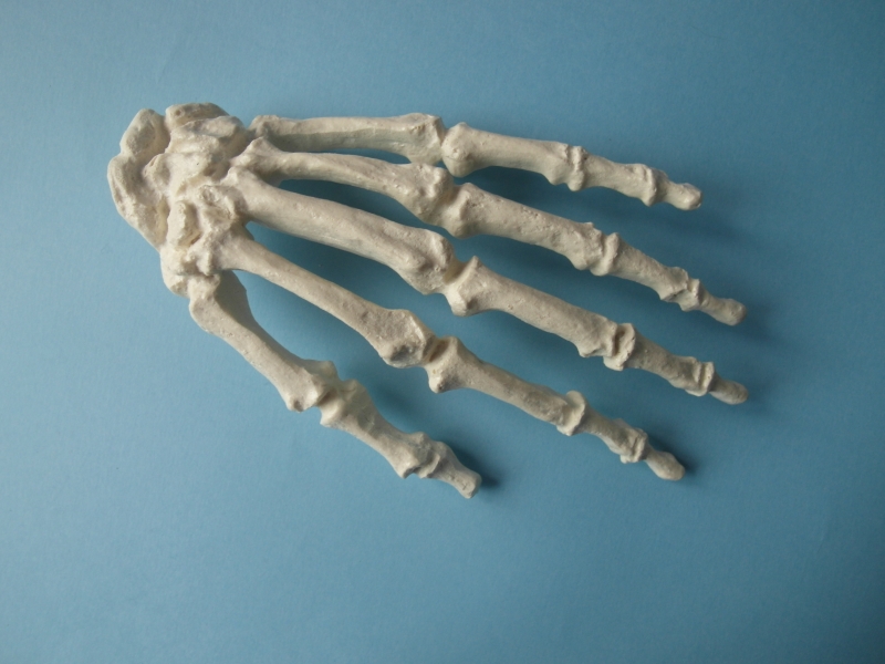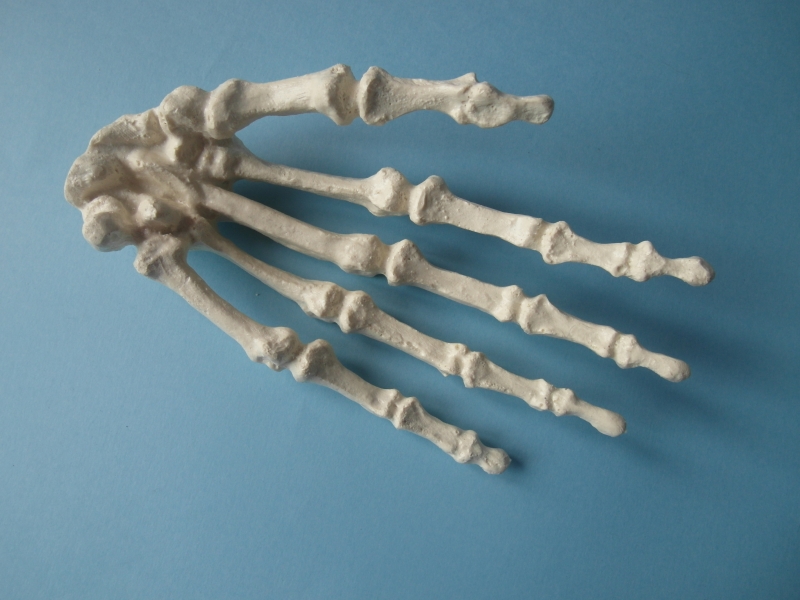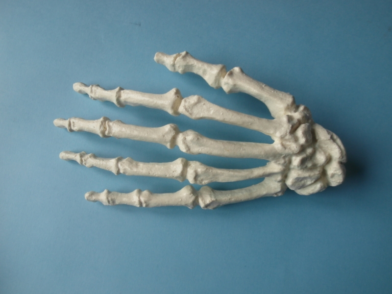 Kości dłoni lewej. Model wykonany w wersji materiałowej C z jednorodnego materiału, wykonany w formie uproszczonej w postaci jednego elementu (stawy nieruchome). Całkowita długość: 210 mm.