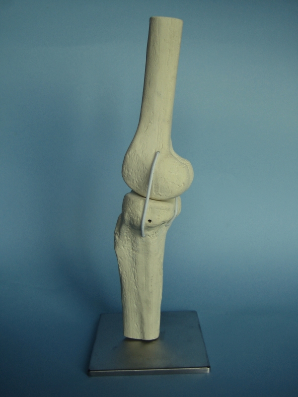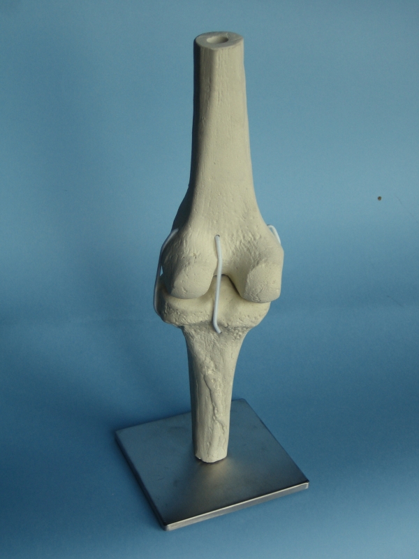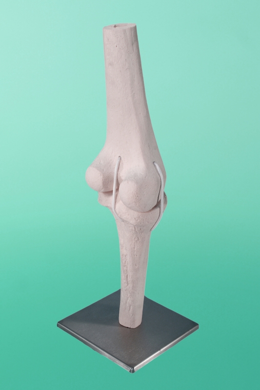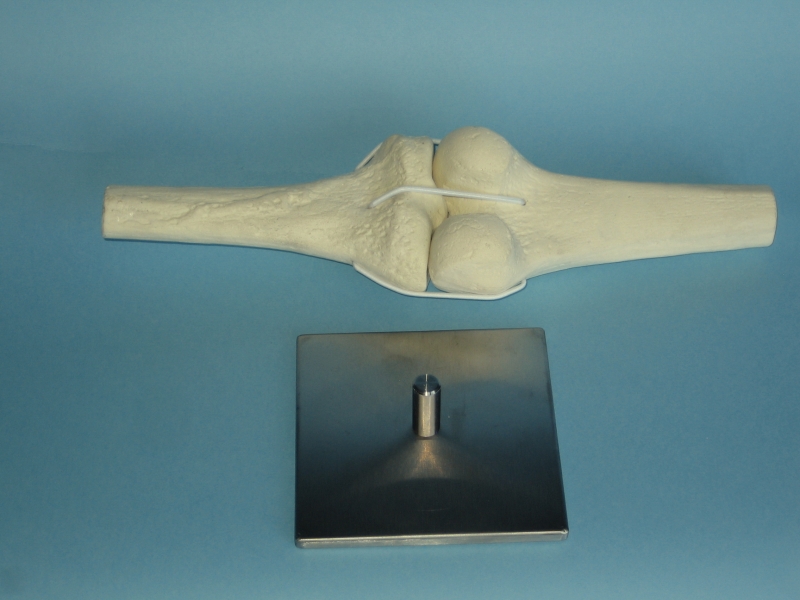Staw kolanowy lewy demo - prezenter. Model czynnościowy prezentacyjny z więzadłami stawowych umieszczony na podstawie. Wykonany w wersji materiałowej B z twardą zewnętrzną warstwą kości i miękką wewnętrzną. Szerokość panewki stawowej 76 mm, wysokość: 325 mm, wymiary podstawy 110 mm x 110 mm.