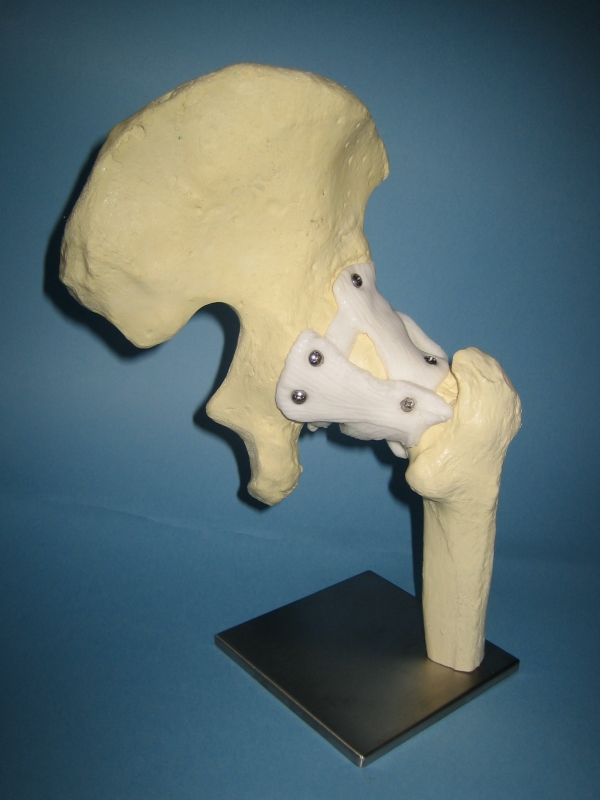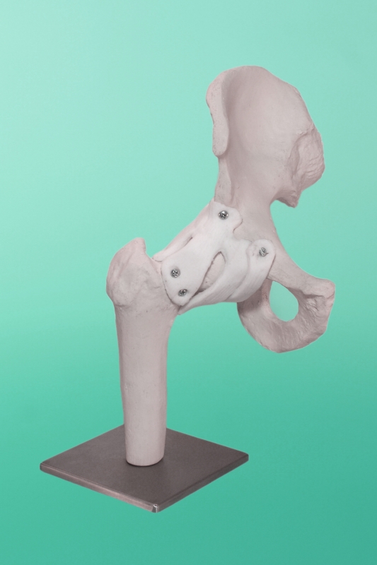 Staw udowy prawy-prezenter. Model czynnościowy prezentacyjny z więzadłami stawowymi umieszczony na podstawie. Kość udowa wykonana w wersji materiałowej B z twardą zewnętrzną warstwą kości i miękką wewnętrzną oraz kością miedniczną wykonaną z jednorodnego materiału w wersji C. Panewka stawowa o średnicy 49 mm. Całkowita wysokość 285 mm, szerokość 200 mm, wymiary podstawy 110 mm x 110 mm.