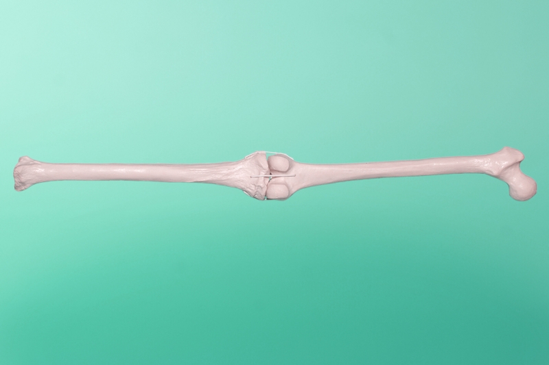 Staw kolanowy średni lewy o łącznej długości 500 mm w wersji materiałowej B, z wewnętrznym walcowym kanałem o średnicy 12 mm. Dwie kości połączone są trzema elastycznymi elementami.