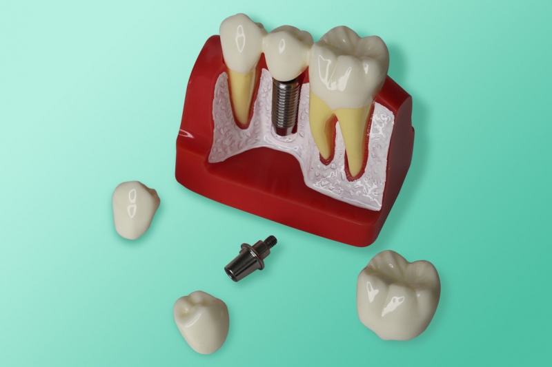 Powiększony demonstracyjny model zębów i implantu. Model wyjaśnia możliwości leczenia. Ułatwi pokazanie pacjentowi jak zastąpić most dentystyczny pojedynczym implantem. Ten wysokiej jakości model ilustruje zagrożenia i problemy wynikające z utraty zębów. Model składa się z metalowego implantu, zdejmowanej 3-punktowej korony mostowej (zęby przedtrzonowe i trzonowy), zdejmowana korona implantu i łącznik. Korony utrzymują się na miejscu dzięki magnesom.
