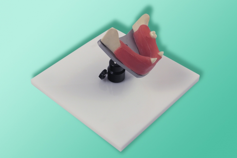 Żuchwa do fantomów z płytą mocującą z wyrostkiem zębodołowym wyścielonym imitacją błony śluzowej oraz zębami wraz z ich korzeniami w pozycji 37, 33, 43 oraz z niezagojonym zębodołem w pozycji 42. W modelu odwzorowano kanały żuchwy i otwory bródkowe. Płytka mocująca umożliwia montaż do większości fantomów znajdujących się na rynku. Model ten można zamontować w dowolnym artykulatorze lub fantomie dentystycznym popularnym na rynku (zalecany manekin to 11-1000), oraz uchwytu 10-9001.