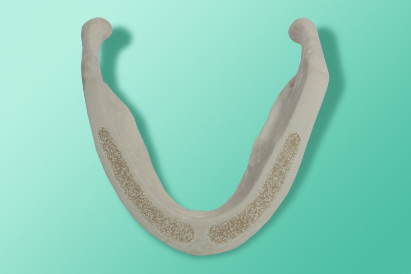 Bezzębna żuchwa z zewnętrzną twardą kością zbitą i wewnętrzną gąbczastą. Model przeznaczony do prowadzenia szkoleń z implantacji.