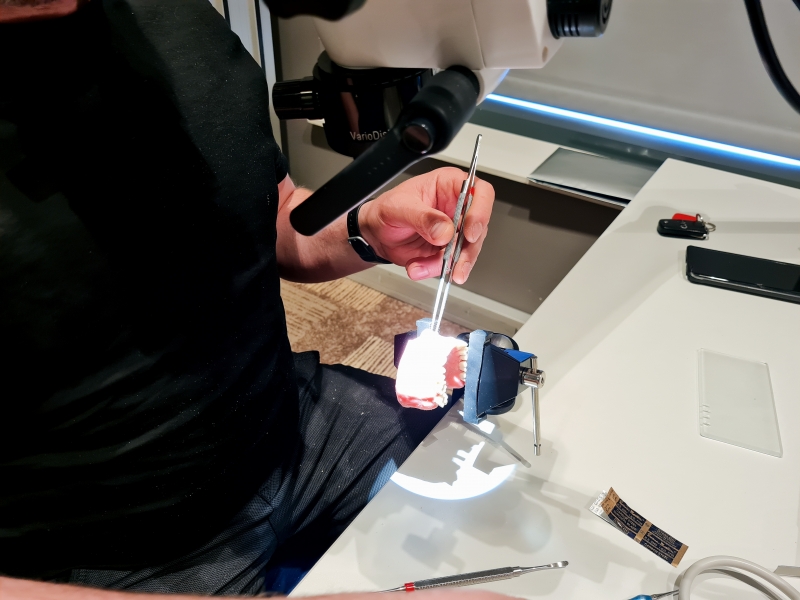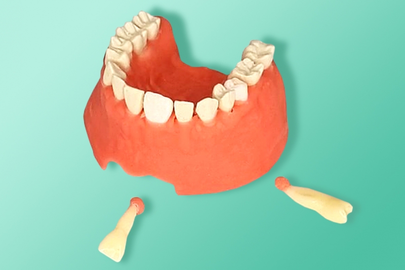 Model do ćwiczenia resekcji korzeni zębów. Przeznaczony jest do demonstracji i treningów w zakresie chirurgii okołowierzchołkowej. Kanały korzeniowe prawego siekacza centralnego i prawego pierwszego przedtrzonowca są wypełnione gutaperką, a w okolicy wierzchołka korzenia znajduje sie zmiana okołowierzchołkowa. Model jest dostarczany z maską dziąsłową umożliwiająca nacinanie i szycie.
